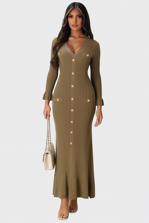 Dieses körperbetonte Maxi-Strickkleid in edlem Olivton ist der perfekte Mix aus Eleganz und Komfort. Der tiefe V-Ausschnitt, die durchgehende Knopfleiste mit goldfarbenen Zierknöpfen und das feine Rippmuster betonen deine Figur auf schmeichelhafte Weise.
