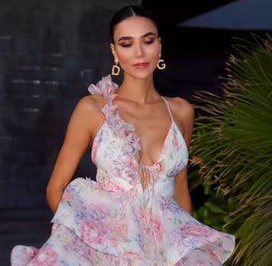 Featuring a delicate blush floral print, thin straps, and a playful layered skirt, this dress brings a soft, dreamy elegance to any look.